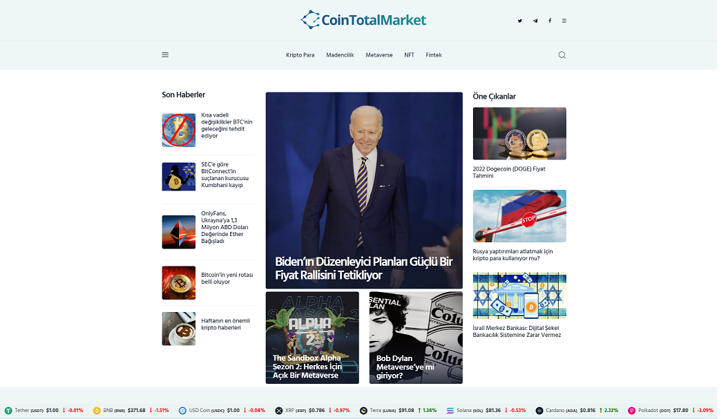 Kripto para, block chain, nft, meta verse, madencilik ve fintek kategorileri başta olmak üzere geleceğin ekonomisini şekillendiren teknolojileri yakından inceleyen ve haberleri en kısa sürede okurlara ulaştıran Coin Total Market yayına başladı.